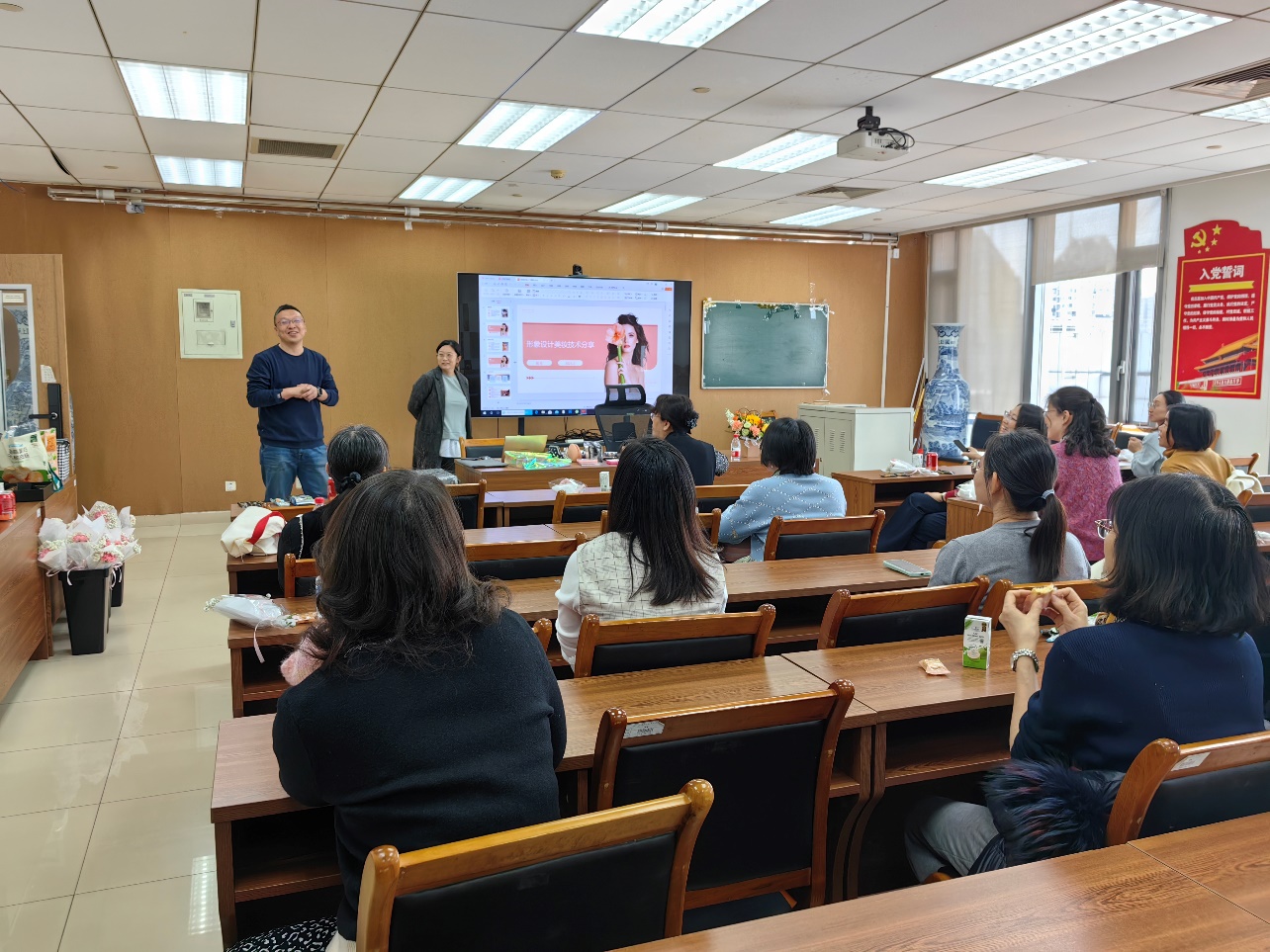 3月6日中午,为庆祝第114个“三八”国际劳动妇女节,学院工会精心策划,学院领导大力支持,王少萍书记亲自参与的“职场美妆课堂”在新主楼E706会议室温馨开启。活动特邀中央电视台资深化妆师吕行老师担任主讲嘉宾,通过专业美妆知识分享与互动体验,为学院女性教职工带来一场兼具实用性与艺术性的美丽盛宴,吸引了女性教职工的热情参与。