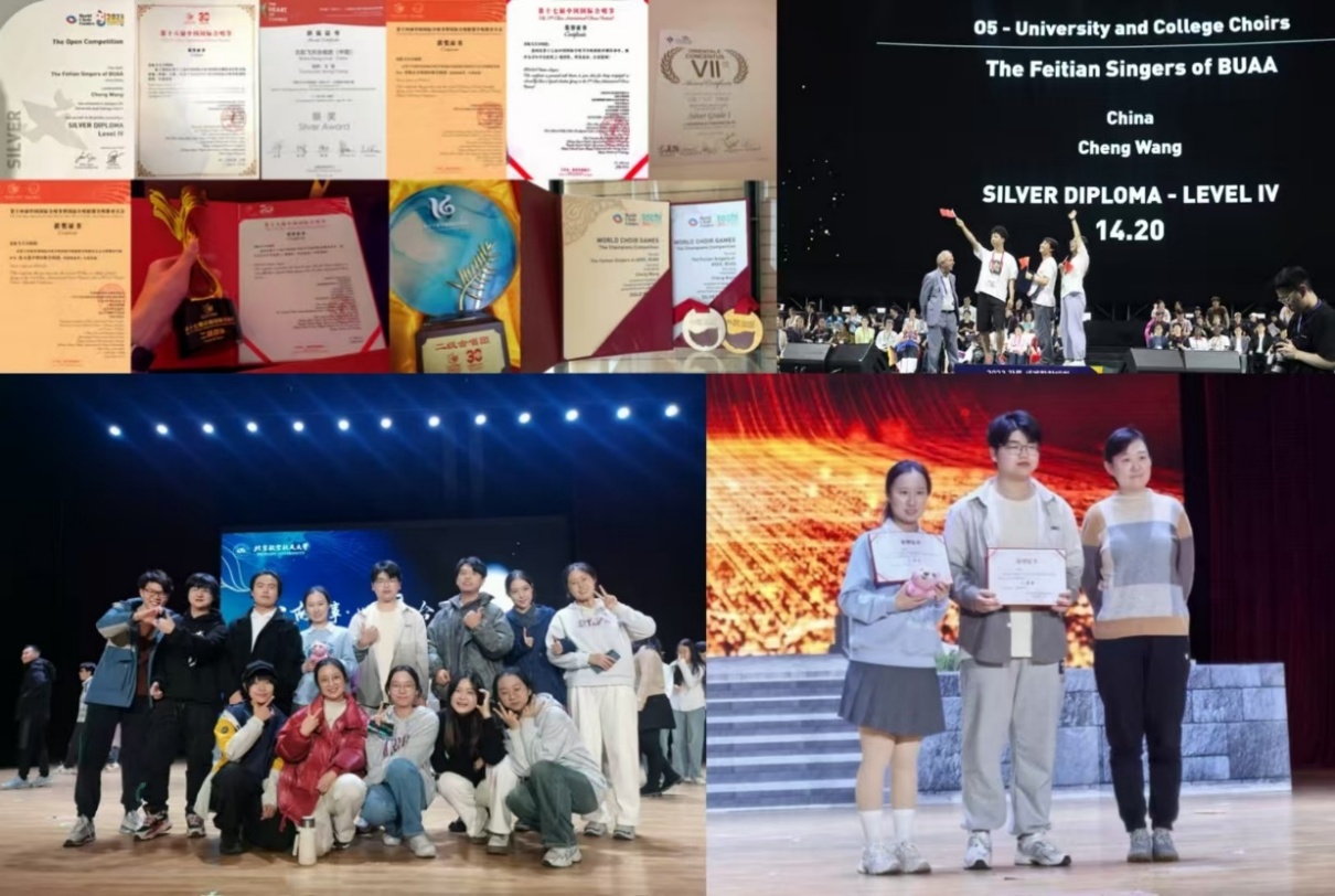 凭借深厚的艺术积淀与专业的指导支持,飞天艺术团在各类赛事中屡创佳绩:飞天合唱团先后斩获俄罗斯索契第九届世界合唱比赛高校组冠军赛金奖、韩国江陵第十二届世界合唱比赛银奖、第六届世界合唱比赛公开赛室内混声组银奖等国际大奖,多次在中国国际合唱节摘得金、银、铜奖,成为北航在国际合唱领域的一张“闪亮名片”;飞天话剧团荣获北京市大学生艺术展演二等奖、首都高校大学生心理健康节心理情景剧展演一等奖等荣誉,原创剧目《九九八十一难》在学院七十周年院庆期间上演,以幽默叙事展现科研报国初心,引发师生强烈共鸣。