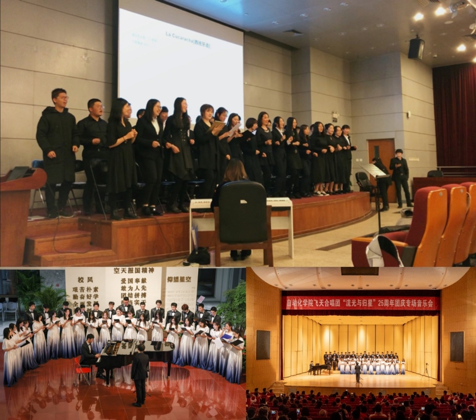 现如今,飞天艺术团已发展为涵盖合唱、话剧、摇滚、书法四个分团的百人规模团队,纵向贯通本科、硕士、博士各学段,横向辐射全校10余个学院,吸引航空、宇航、计算机、材料等不同专业背景的学子在此汇聚,形成“工科底色+艺术素养”的独特团队气质。自2004年起,艺术团持续推出“飞天剧”、专场音乐会、公开排练课等高品质美育博雅课程,其中“飞天剧”凭借对空天文化、红色故事的艺术演绎,成为北航校园文化的经典IP;“流光与归星”等专场音乐会,多次引发校园艺术热潮,累计吸引师生观众超2万人次。